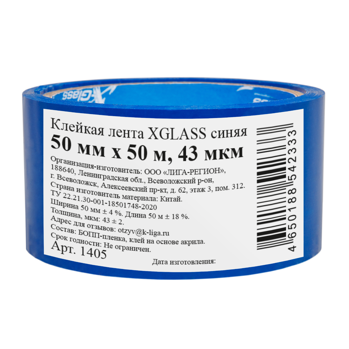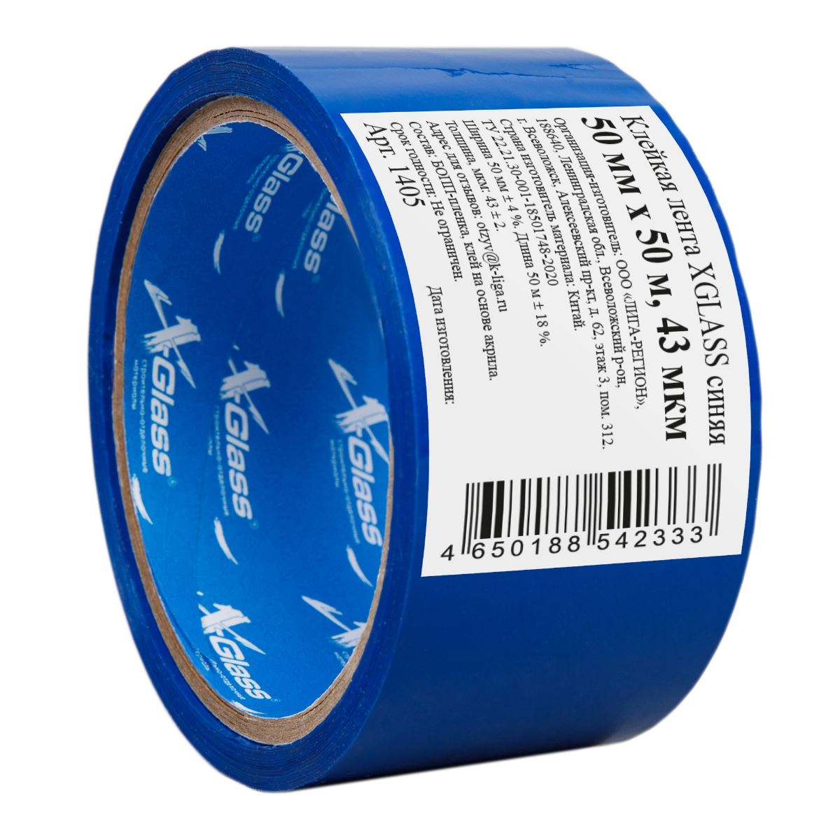 Лента упаковочная клейкая Xglass 1405 синяя 43 мкм 50 мм 50 м